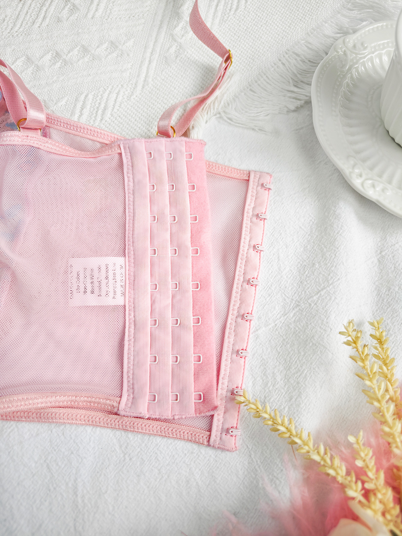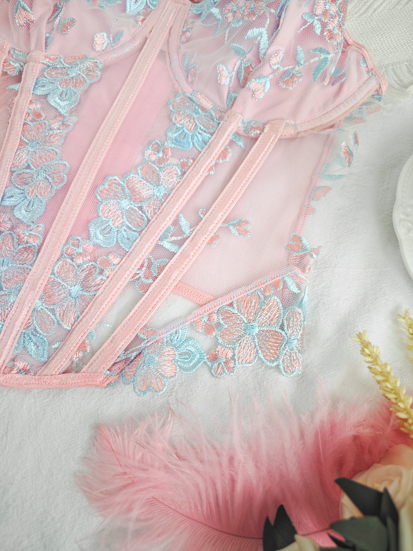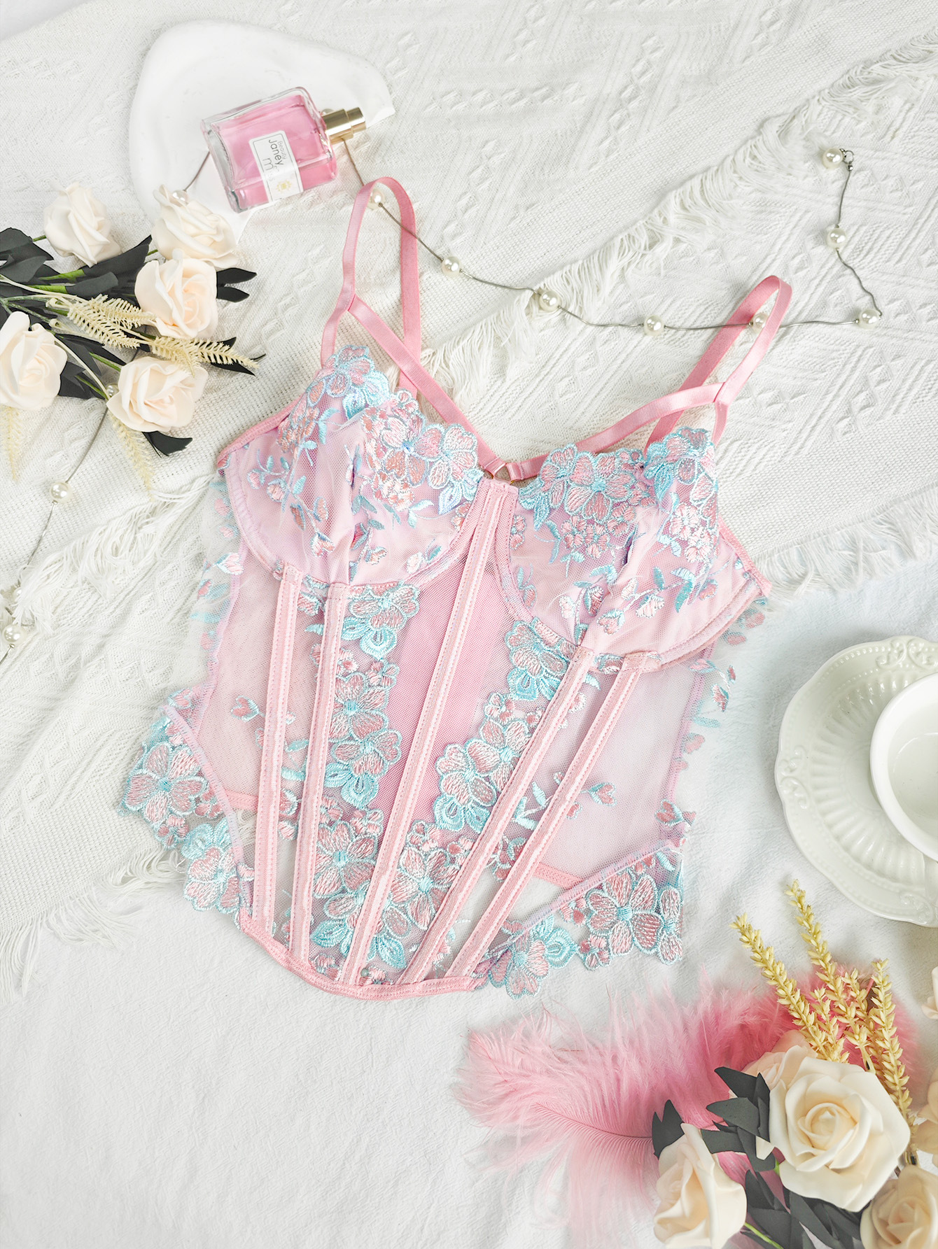 Element: Embroidery,Boning,Cutout,Lace/Tulle/Fishnet,hook closure