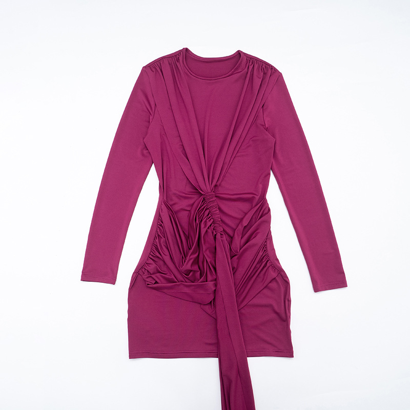 Long Sleeve Short Shirring Tied Short Dress In Magenta or Black
