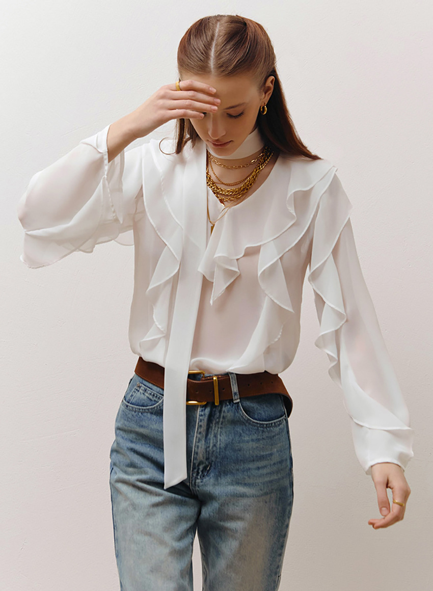 V neck Flounce Long Sleeve Loose Shirt Design Office All Matching Top