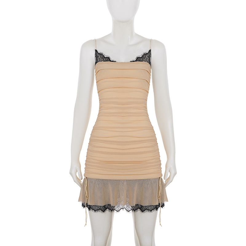 Sexy Spaghetti Strap Lace Shirred Dress W/ Contrast Peekaboo Black Lace