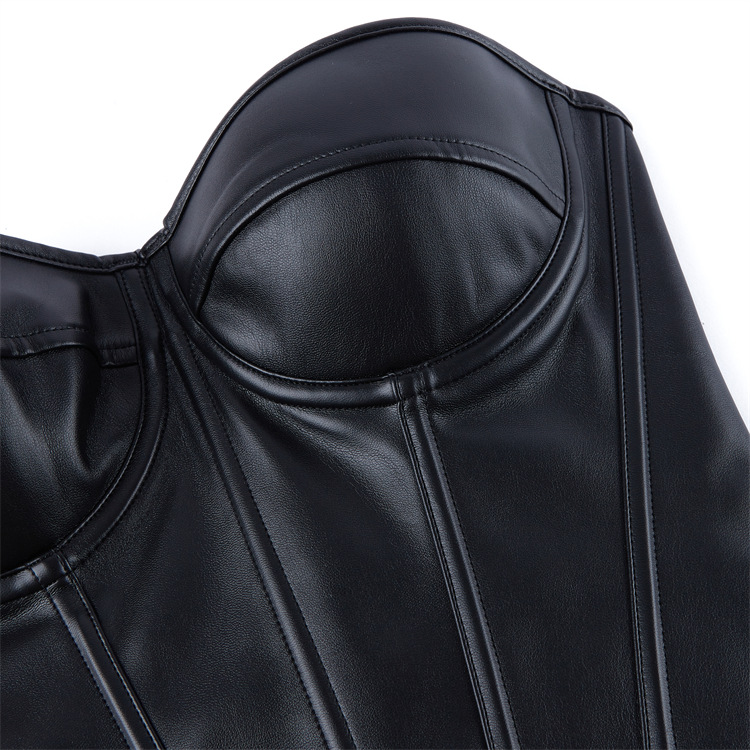 Black Faux Vegan Pleather Corset Y2K Barbarella w Faux Boning