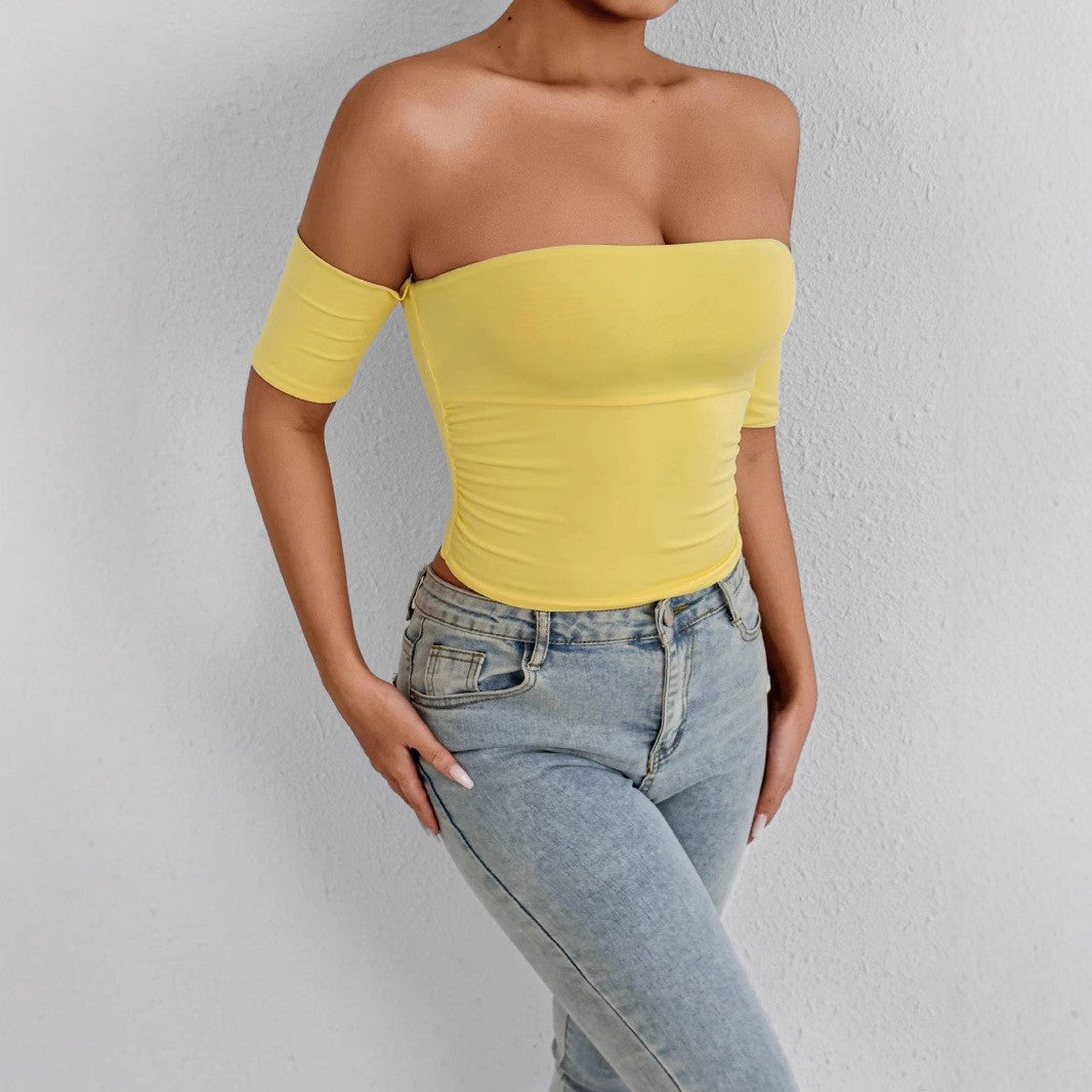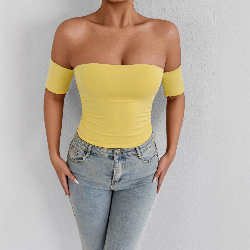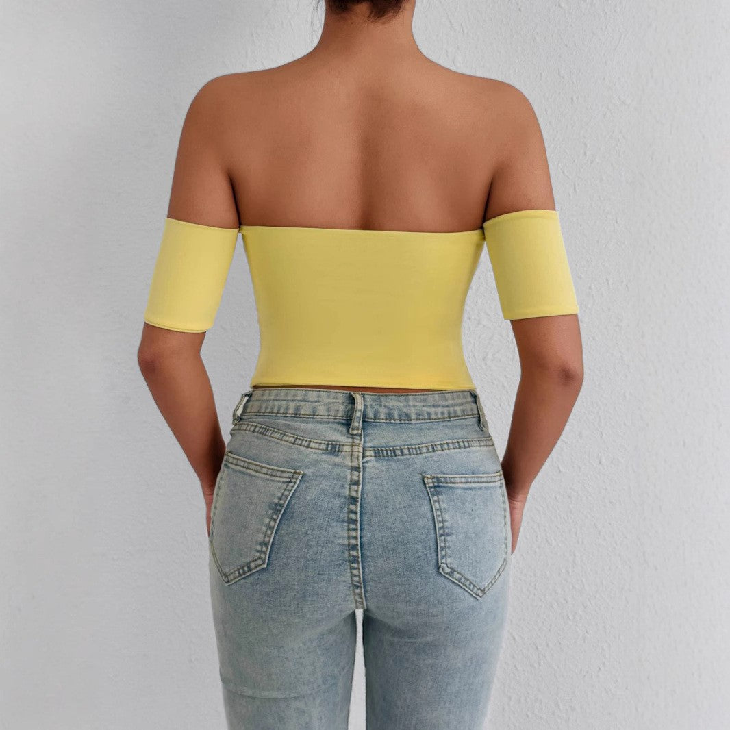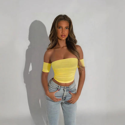 Yellow off the shoulder fitted top with short sleeve